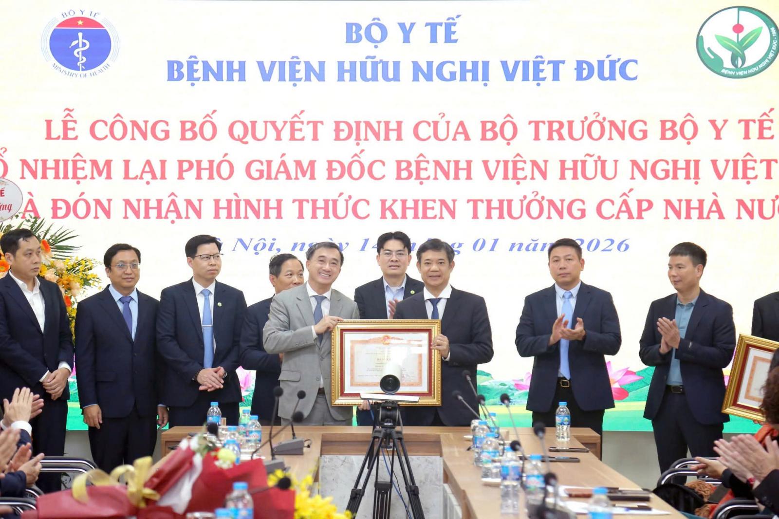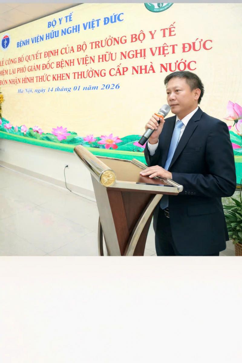 Chiều ngày 14/01/2026, tại Hà Nội, Bệnh viện Hữu nghị Việt Đức đã long trọng tổ chức Lễ công bố Quyết định của Bộ trưởng Bộ Y tế về việc bổ nhiệm lại chức vụ Phó Giám đốc Bệnh viện Hữu nghị Việt Đức, đồng thời đón nhận Bằng khen của Thủ tướng Chính phủ trao tặng cho các tập thể và cá nhân có thành tích xuất sắc trong sự nghiệp chăm sóc, bảo vệ sức khỏe nhân dân. Tại buổi lễ, Thạc sĩ Đinh Hồng Thái – Phó Giám đốc Bệnh viện Hữu nghị Việt Đức đã phát biểu nhận nhiệm vụ, bày tỏ sự trân trọng và cảm ơn sâu sắc đối với sự tin tưởng của Lãnh đạo Bộ Y tế, Ban Giám đốc Bệnh viện cùng toàn thể cán bộ, viên chức, người lao động. Đồng chí khẳng định sẽ tiếp tục nỗ lực, cùng tập thể lãnh đạo và cán bộ bệnh viện giữ vững tinh thần đoàn kết, phát huy truyền thống, nâng cao chất lượng khám chữa bệnh và hiệu quả công tác quản lý, góp phần xây dựng Bệnh viện Hữu nghị Việt Đức ngày càng phát triển bền vững.