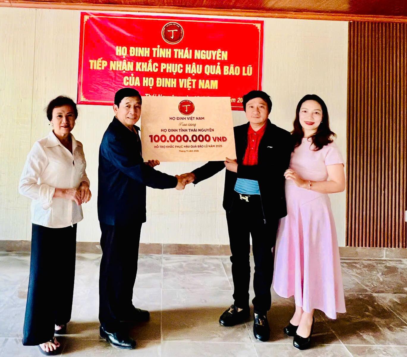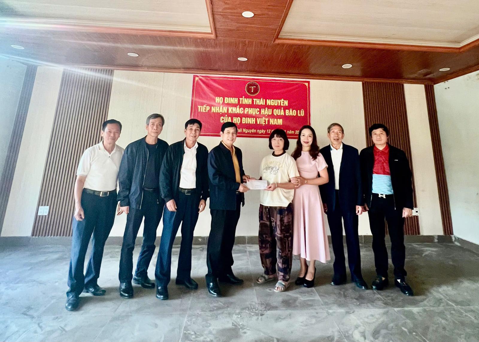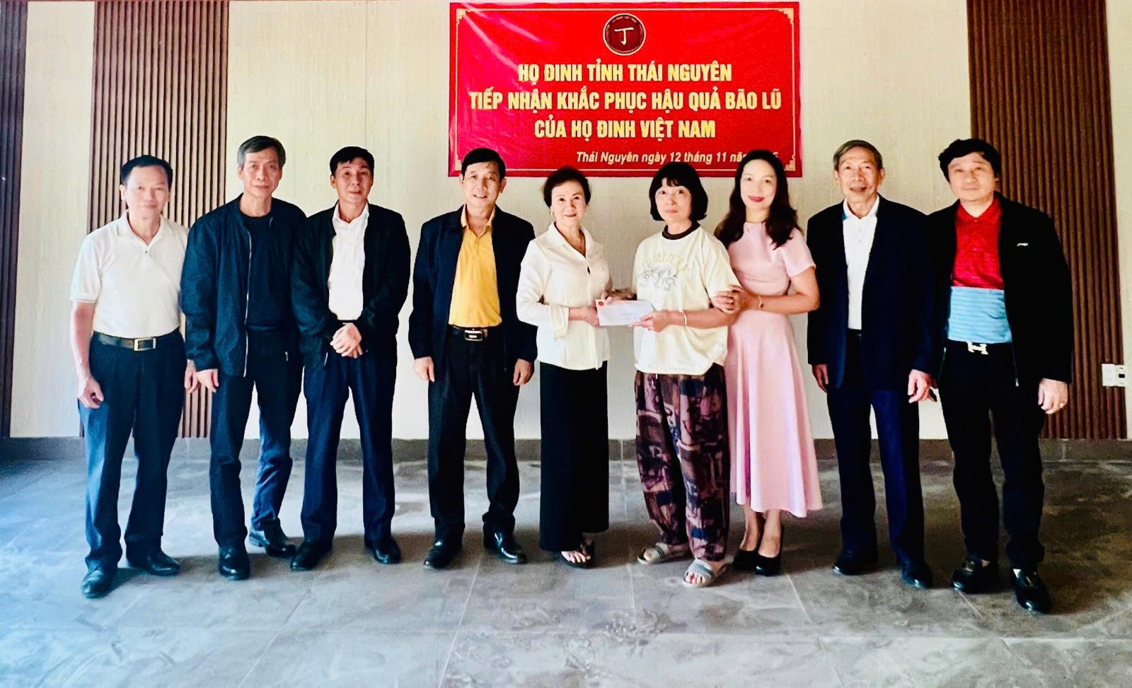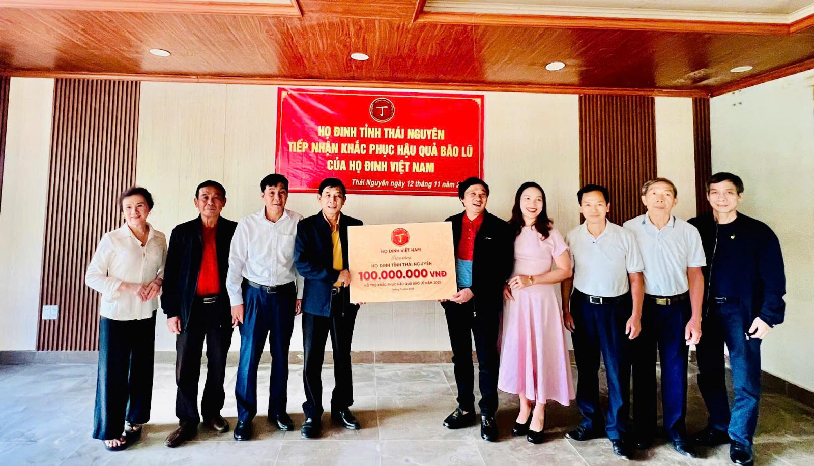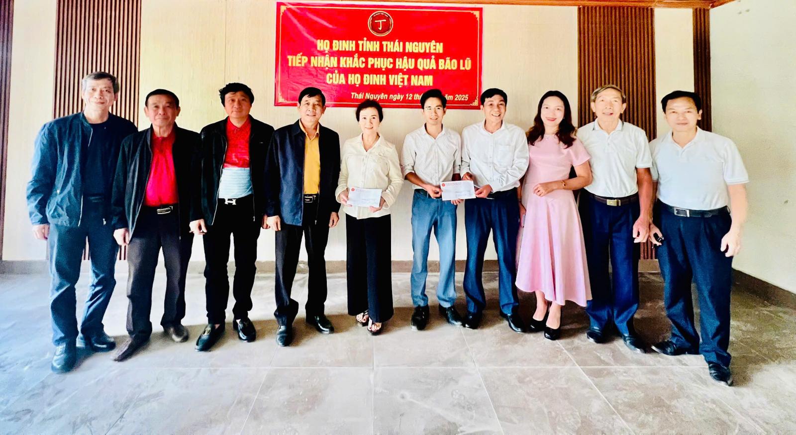 Chiều ngày 12/11/2025, tại KS Dòng Sông Xanh. Đại diện BLL họ Đinh Việt Nam do GS TS, Phó BLL họ Đinh Việt Nam, ông Đinh Văn Hiến, trưởng đoàn. Cùng bà Đinh Thị Thúy, Tổng thư ký BLL họ Đinh Việt Nam, phó trưởng đoàn. Đã đến trao quà ủng hộ bà con họ Đinh Thái Nguyên bị ảnh hưởng bão lụt nặng nề, số tiền là: 100.000.000₫, (Một trăm triệu đồng).